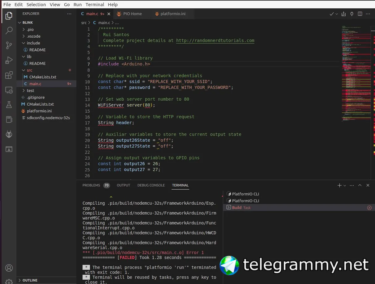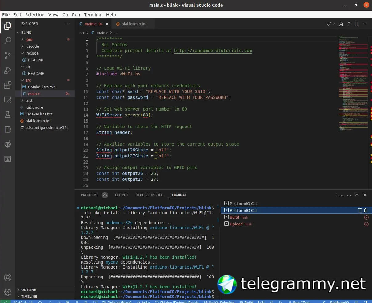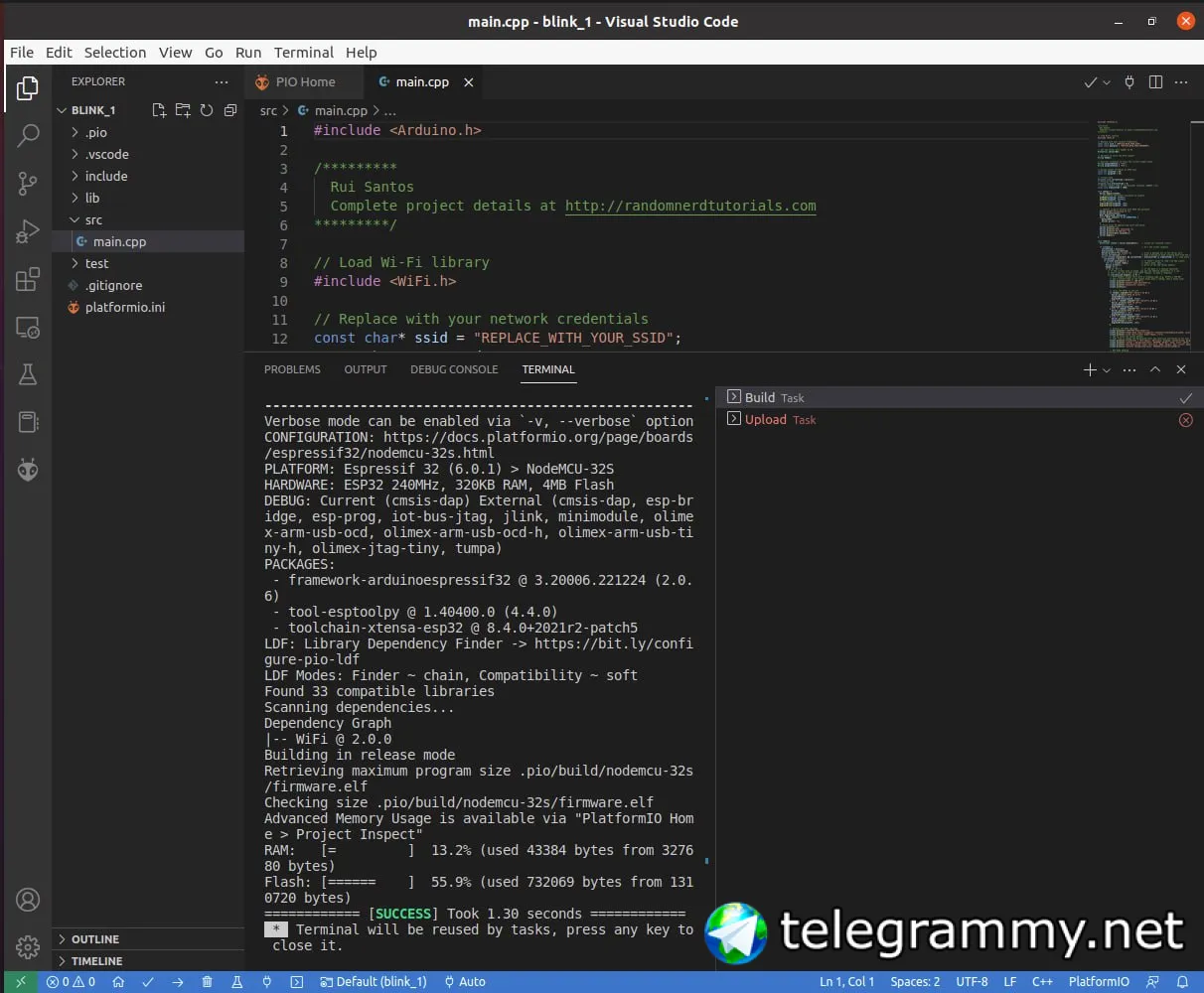 Для новичков проще брать Arduino и смотреть примеры при установке framework-а, все это находится (хоть и не сразу) в закладке PIO Home.