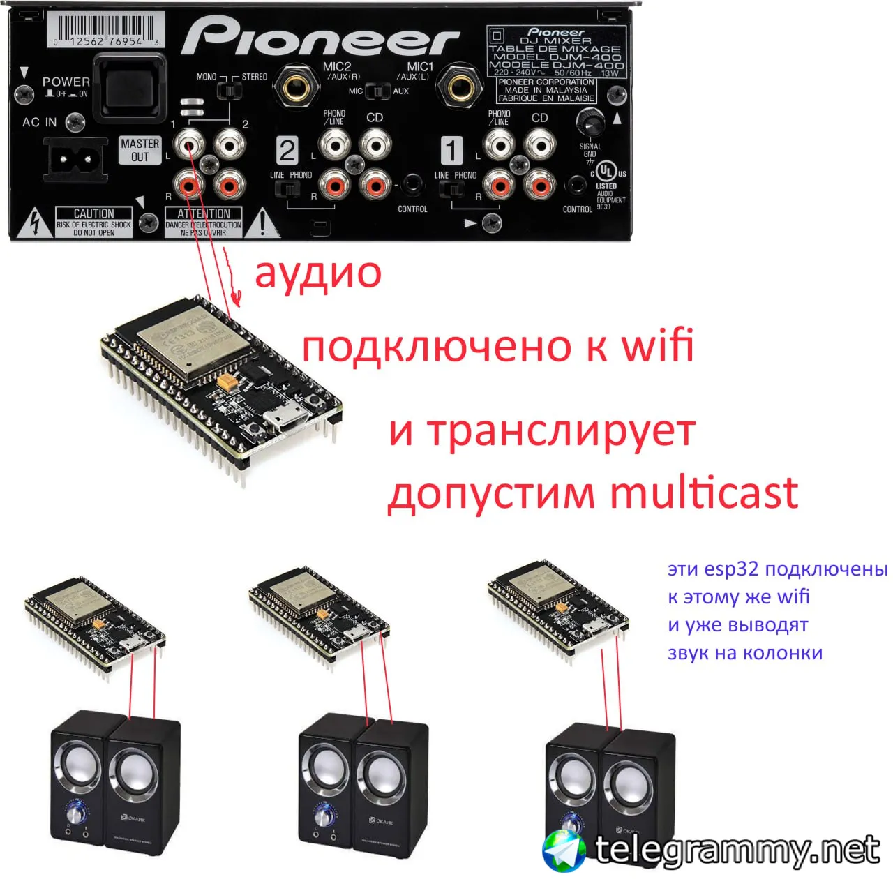 есть вопрос.. хочу сделать так... предполагаю... esp32 чтобы в него входил аудио сигнал стерео, он был бы подключен к wifi и три клиента тоже на esp32 с минимальной задержкой на подключенных к ним колонках играл...