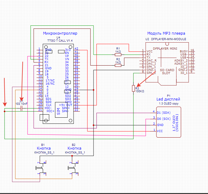 А вот со схемой подключения плеера к GSM модуля я так и не понял, точнее для меня, как для человека изучающего физику 20 лет назад непонятно, как можно подключить динамик к микрофону, так еще и одной клеммой через конденсатор