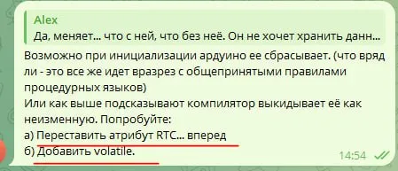 Возможно при инициализации ардуино ее сбрасывает. (что вряд ли - это все же идет вразрез с общепринятыми правилами процедурных языков)