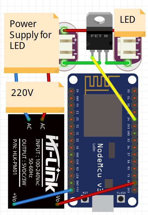 Транзистор так устроен, что у него нету физической развязки между выводами. Поэтому ток может протекать с затвора на сток. Поэтому между затвором транзистора и пином ставят токоограничивающий резистор ом так 200. Ещё не хватает подтягивающего резистора. И коллеги правильно сказали, что транзистор mosfet нужно подобрать такой, который открывается от напряжения логического уровня esp, т.е 3.3в. схема примерно такая должна получиться.
