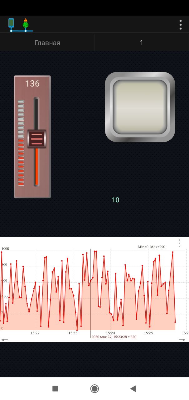 Фото пожалуйста 😄 на данный момент есть кнопка управления светодиодом в D2 и от виртуальных pin-нов приходят данные. V1 движок - пишет числа в сериал. V4 и V5 передает рандомные значения из платы в телефон и рисует график.
