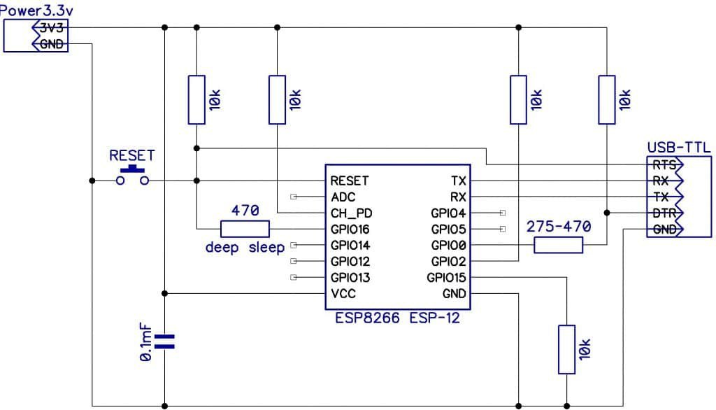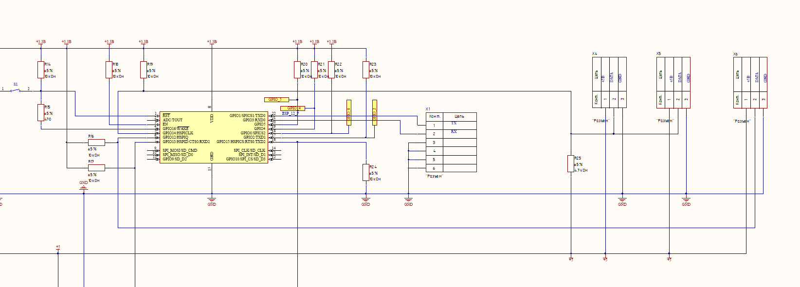 На этих схемах не показано подключение ADC и свободных GPIO — их подключение будет зависеть от того, что вы захотите реализовать, но если хотите стабильности, то не забудьте притянуть все GPIO к питанию (pullup)