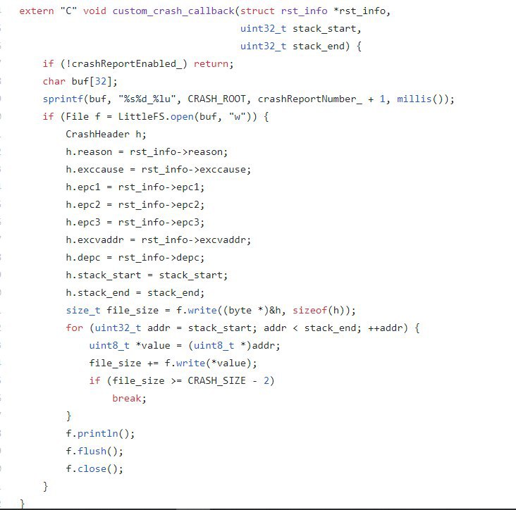 Это под 8266 я так понимаю? Меня интересует esp-idf под 32, поставил чекбокс coredump во flash, при краше пишет что запись проведена, читаю всю память, вижу что там что-то записано, но не пойму в каком формате, и как его расшифровать, явно не то что в примере показано, вот и думаю где косяк.