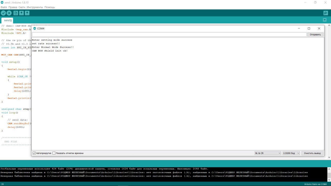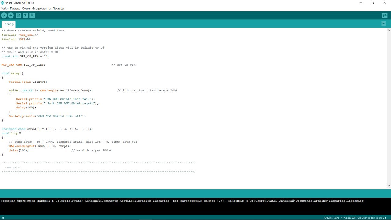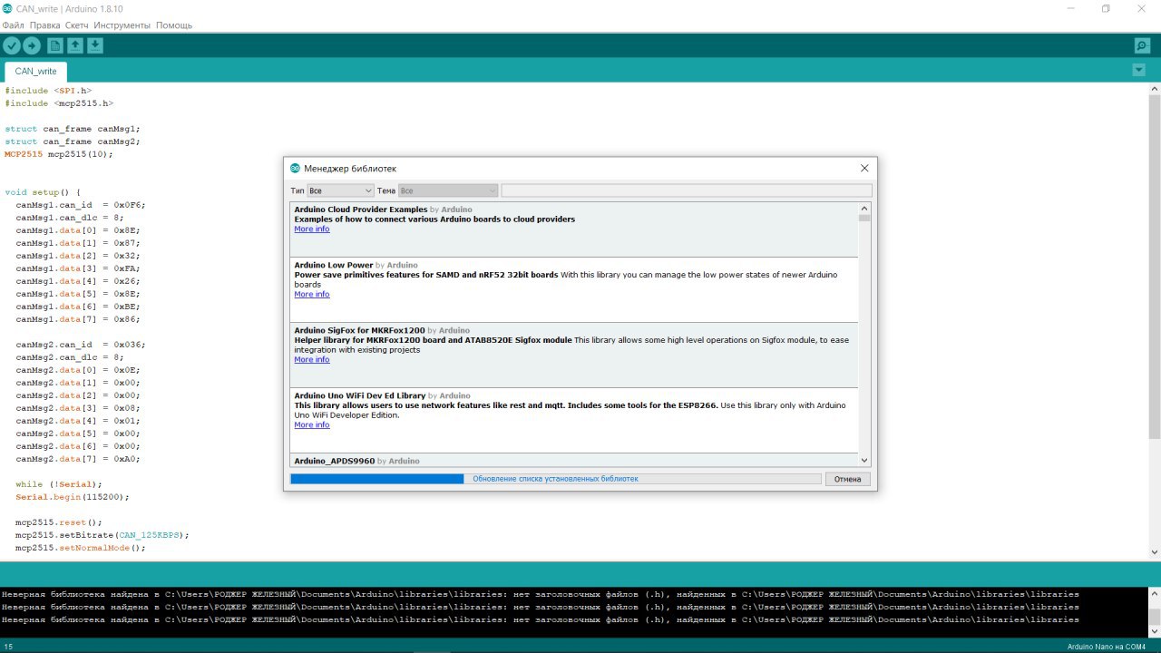 Возникла проблема, использую ARDUINO NANO и MCP2515, все подключил согласно инструкции, скрипт из примера. Соорудил перемычку из резистора 120 ом. На H 2,73 вольта L 1,8 вольта без резистора, с резистором H 2.43 , L 1.65 вольт. Но я не вижу пакеты, что делать? почему может не работать как Это сделать скрипт прилагаю.
