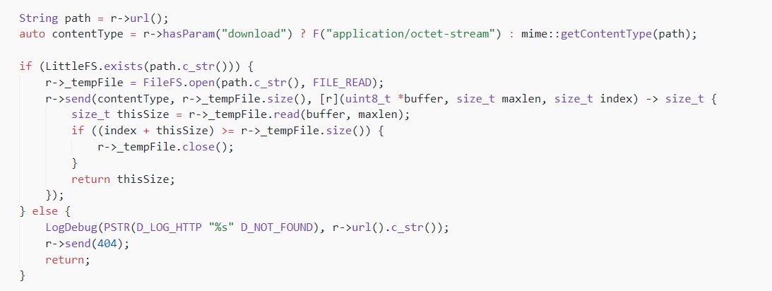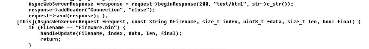 server.on("/update", HTTP_POST, [](AsyncWebServerRequest *request){ shouldReboot = !Update.hasError(); AsyncWebServerResponse *response = request->beginResponse(200, "text/plain", shouldReboot?"OK":"FAIL"); response->addHeader("Connection", "close"); request->send(response); },[](AsyncWebServerRequest *request, String filename, size_t index, uint8_t *data, size_t len, bool final){ if(!index){ Serial.printf("Update Start: %s\n", filename.c_str()); Update.runAsync(true); if(!Update.begin((ESP.getFreeSketchSpace() - 0x1000) & 0xFFFFF000)){ Update.printError(Serial); } } if(!Update.hasError()){ if(Update.write(data, len) != len){ Update.printError(Serial); } } if(final){ if(Update.end(true)){ Serial.printf("Update Success: %uB\n", index+len); } else { Update.printError(Serial); } } });