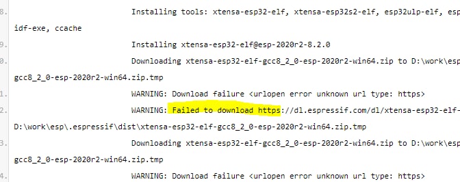 в логе ссылка на файл https://dl.espressif.com/dl/xtensa-esp32-elf-gcc8_2_0-esp-2020r2-win64.zip и она рабочая, если в браузере открыываю предлагает скачать 106.5 Мб