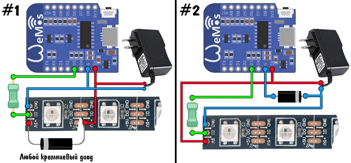Если поставить диод на землю, сдвинуться выходные напряжения есп, относительно ленты, было 0-3.3В, станет ~0.7-4.0В