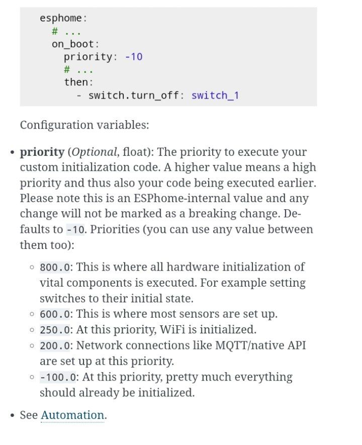 помогите разобраться с приоритетом на esphome. хочу уменьшить время получения ip по eth порту. сейчас 20сек, хотябы до 10 сократить. нашел приоритет параметр on_boot