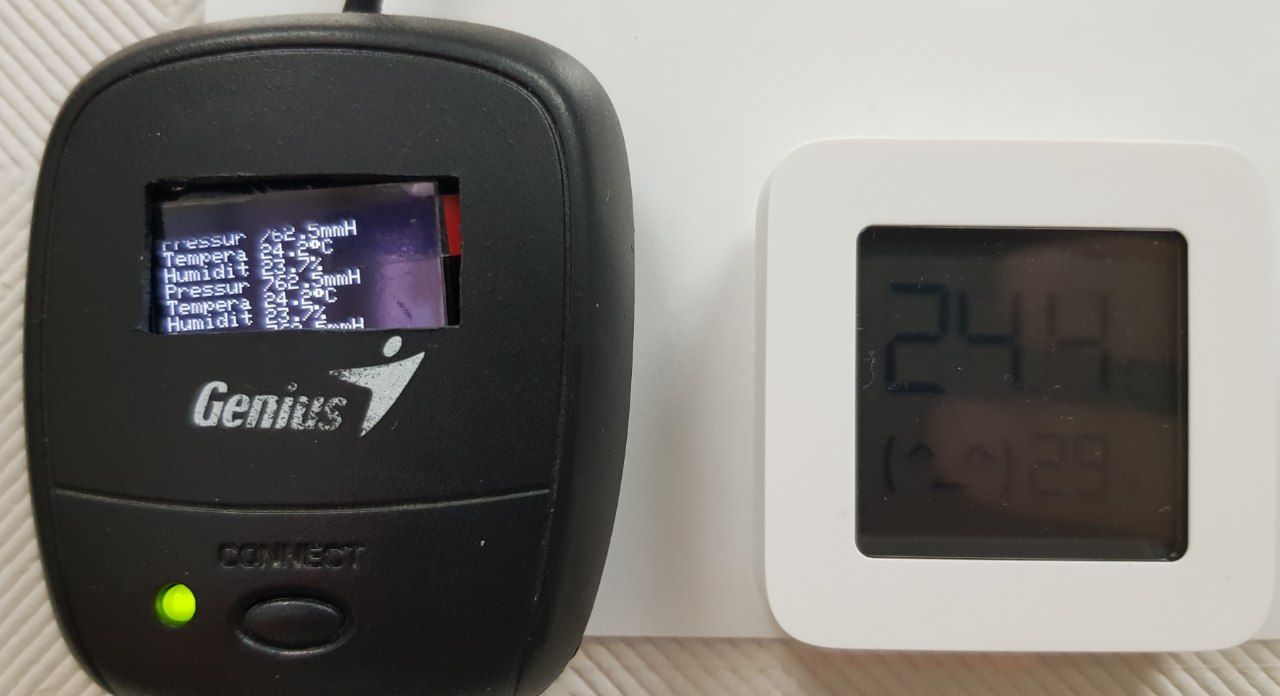 Слева esp8266 и bme280 и справа xiaomi датчик. Почти сходятся показания. Хотя bme стоит вместе с экранчиком котрый греется в одном корпусе.