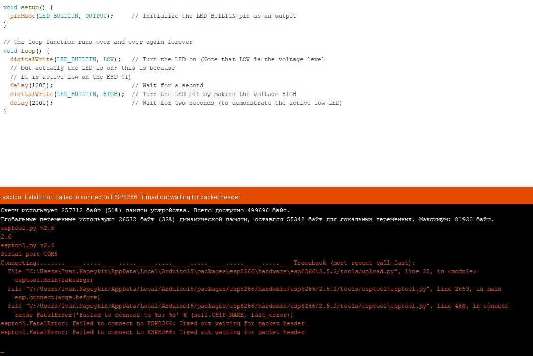В менеджере выбрал generic esp8266 модуль, также пытался использовать разные скорости загрузки, разные памяти, но все заканчивается одной ошибкой: