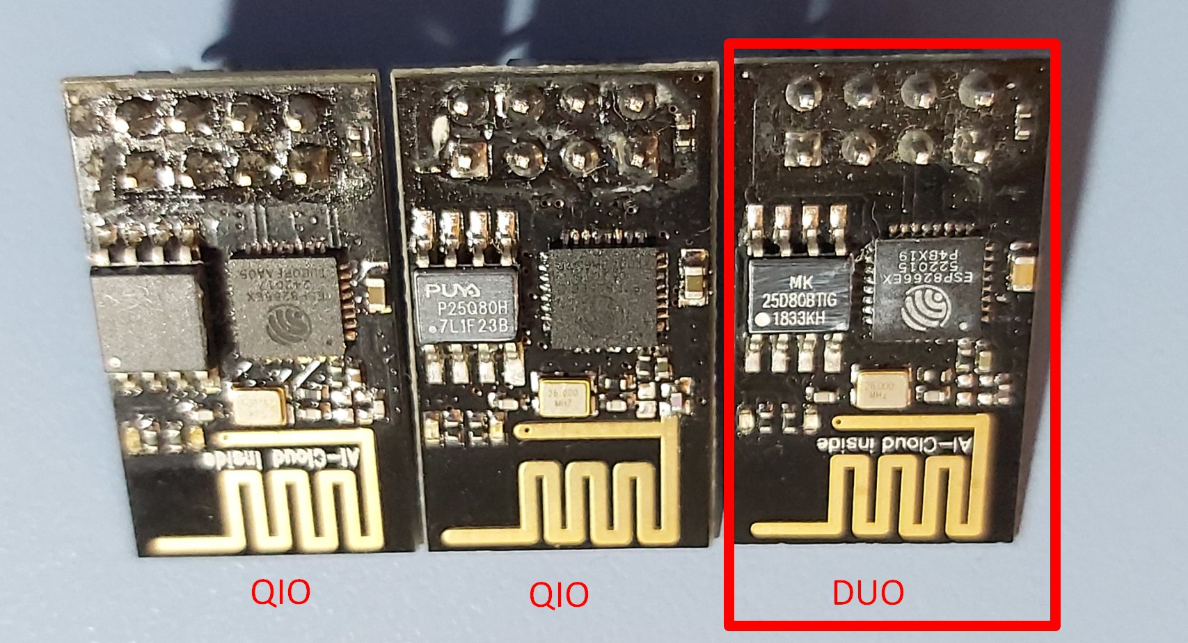 p.s. Выбор этого режима зависит от вашего модуля — одни модули работают в DIO, другие в QIO. Часто это написано на самом модуле. Также есть модули, работающие в обоих режимах, если установить на какой режим рассчитан модуль не удаётся, то можно протестировать его работу сначала в одном режиме, затем в другом.