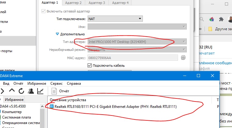 сверху указано имя виртуальной сетевой карты которая самой виртуалки внутри работает а снизу указано имя реальные сетевые карты на холсте