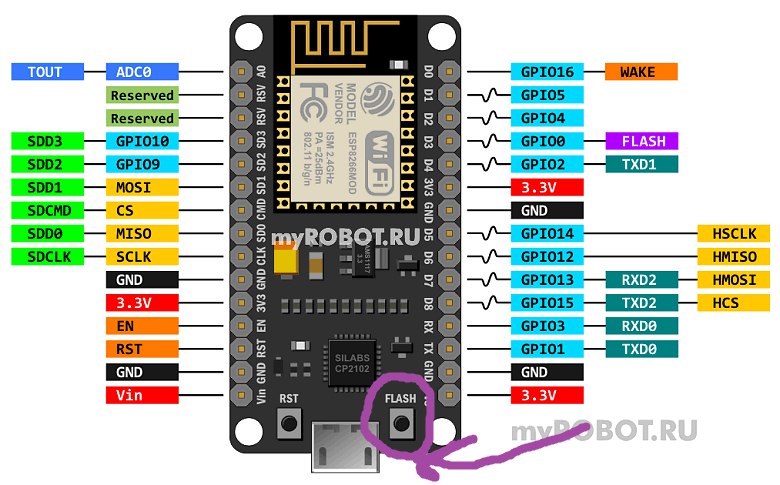 Вторая кнопка FLASH в левом нижнем углу, кнопка загрузки, используемая при обновлении прошивки, вывод GPIO0.