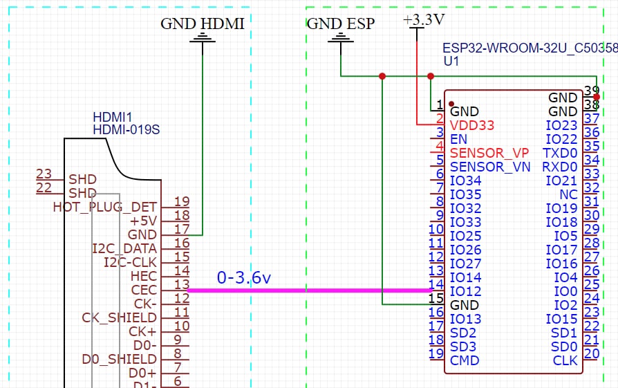 Есть телевизор с HDMI-выходом в составе которого линия CEC (3.3в, в прыжке 3.6в). Есть ESP32 на пине которой я хочу этот CEC-сигнал