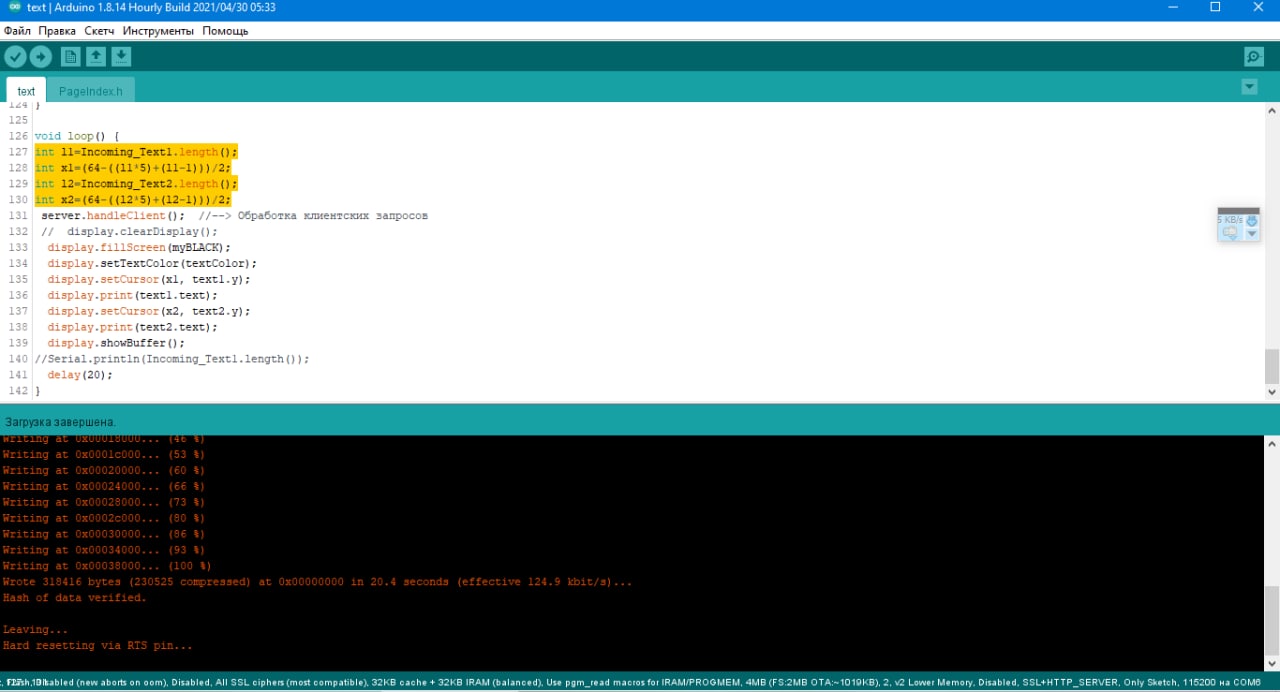 вот такую вот формулу написал чтоб писалась по центру. длина LED панели 64 пикселя. берётся длина слова умножается на 5(ширина буквы в пикселях) плюсуется длина слова минут 1 это количество пробелов в пикселях. все это вычитывается из ширины LED панели и делится на 2 и остаток указывается в виде начала в пикселях