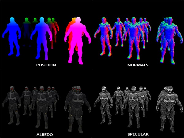 А на втором проходе — пихаем сразу все эти канвасы в свежий шейдер, и на основе полученных данных уже считаем весь адовый матан со всем графонием/освещением/отражениями/материалами и прочим говнищем.