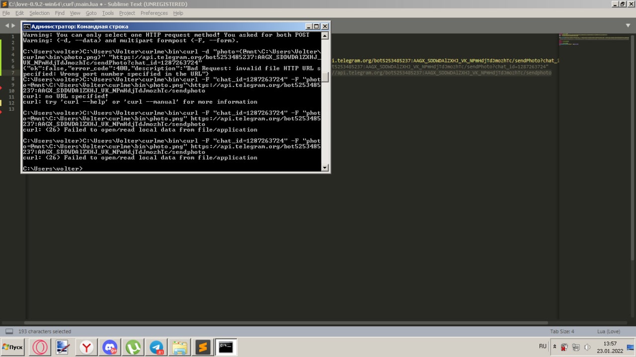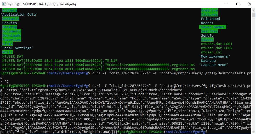C:\Users\Volter\curlme\bin\curl -d -F "photo={C:/Users/Volter/curlme/bin/photo.png}" "https://api.telegram.org/bot5253485237:AAGX_SDDWDAlZXHJ_VK_NPmHdjTdJmozhTc/sendPhoto?chat_id=1287263724"