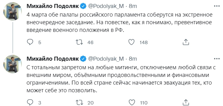 "На повестке, как я понимаю, превентивное введение военного положения в РФ. С тотальным запретом на любые митинги, отключением любой связи с внешним миром, объёмными продовольственными и финансовыми ограничениями. По всей стране сейчас начинается эвакуация тех, кто может себе это позволить", — написал Подоляк.