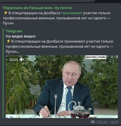 Правда: Президент РФ Владимир Путин лично опроверг эту информацию. Он подтвердил, что на Украине задействованы только профессиональные военные, там нет ни призывников, ни резервистов.