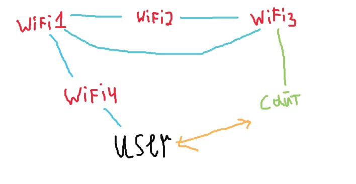 user отправляет запрос, он подключен к wifi-4, wifi-4 -> wifi1 -> (wifi2->wifi->3) or wifi3 —> сайт