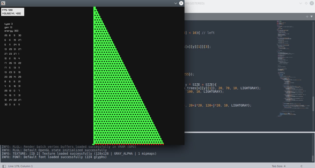 Скорее всего будет два массива, один будет хранить информацию о активном гене и типе пиксиля (семя, дерево, отросток), второй массив будет содержать указатель на структуру с деревом.