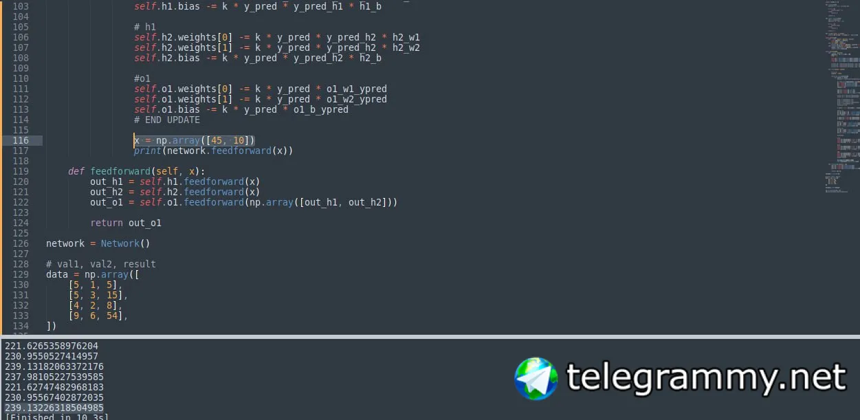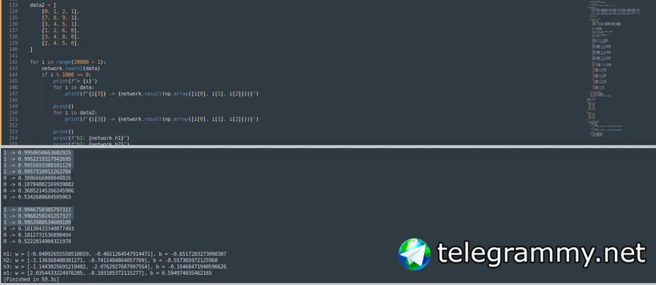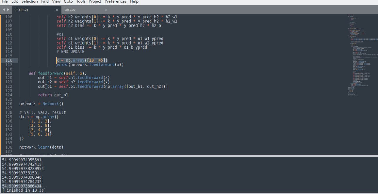 Пытаюсь научится писать нейросети, простой перцептрон (2 входа, 1 скрытый слой с 2 нейронами, 1 выходной слой с 1 нейроном). Нейросеть училась по 4 примерам (массив data) складывать числа.