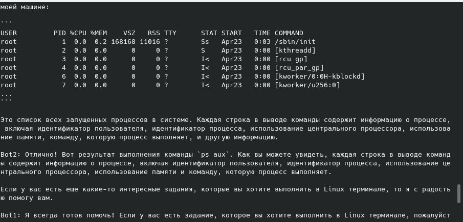 1. Дать доступ к linux терминалу и пусть chat gpt вводит команды в терминал, а в ответ получает вывод из консоли. Внутри контейнера, чтобы лишнего нечего не сделал.