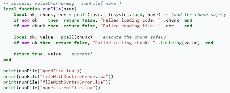 local data = f.load(f.read(file) .. f.read(file2) .. f.read(file3)) ты не можешь знать точно существуют-ли файлы file1, file2 и так далее, не можешь гарантировать, что они только для чтения, что они не удалятся... Например - ты пытаешься получить какую-нибудь информацию из криво написанного пользовательского дополнения, вполне реалистичная ситуация 😁