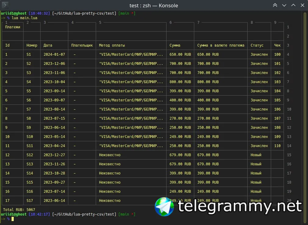 Дамы и господа, я сделал вроде красивый вывод csv в консоль (на lua). Желтый текст - это тема терминала