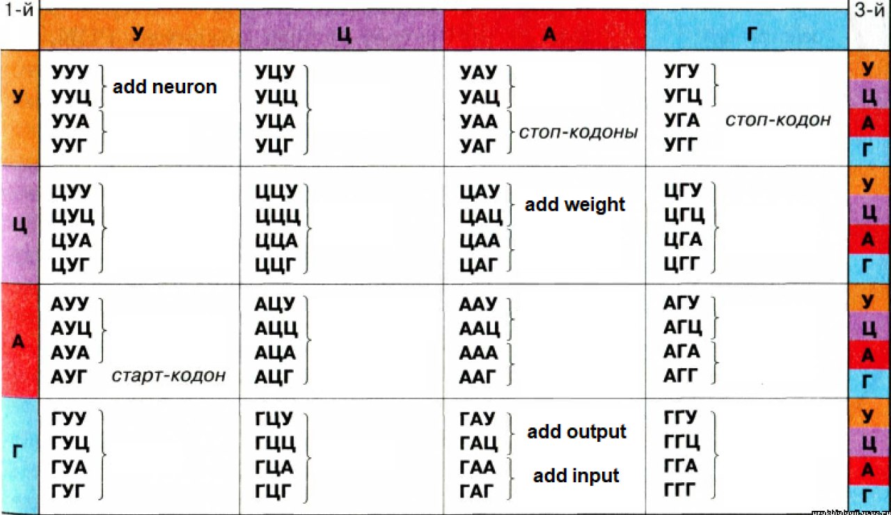 Сейчас я пытаюсь придумать способ представить нейросеть в виде кода ДНК. Я взял таблицу генетического кода, оставил там только нужное (старт/стоп кодоны) и вот сейчас думаю как бы так удачно разместить команды. Пока просто рандомным триплетам присвоил команды