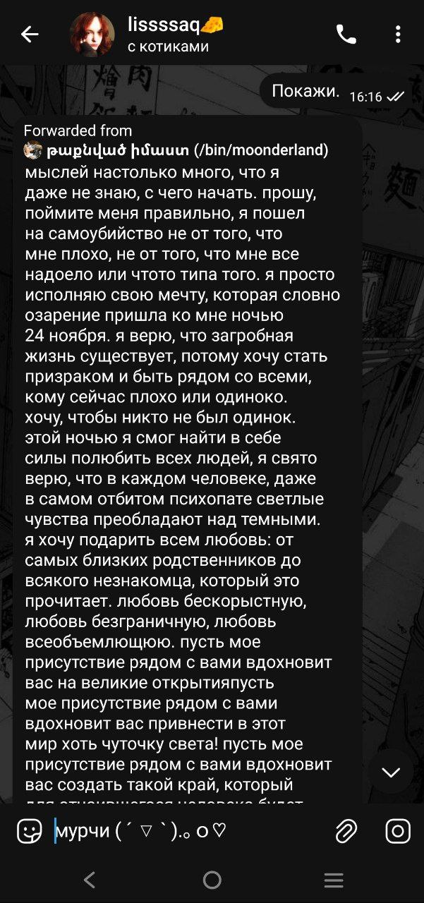 мыслей настолько много, что я даже не знаю, с чего начать. прошу, поймите меня правильно, я пошел на самоубийство не от того, что мне плохо, не от того, что мне все надоело или чтото типа того. я просто исполняю свою мечту, которая словно озарение пришла ко мне ночью 24 ноября. я верю, что загробная жизнь существует, потому хочу стать призраком и быть рядом со всеми, кому сейчас плохо или одиноко. хочу, чтобы никто не был одинок. этой ночью я смог найти в себе силы полюбить всех людей, я свято верю, что в каждом человеке, даже в самом отбитом психопате светлые чувства преобладают над темными. я хочу подарить всем любовь: от самых близких родственников до всякого незнакомца, который это прочитает. любовь бескорыстную, любовь безграничную, любовь всеобъемлющюю. пусть мое присутствие рядом с вами вдохновит вас на великие открытияпусть мое присутствие рядом с вами вдохновит вас привнести в этот мир хоть чуточку света! пусть мое присутствие рядом с вами вдохновит вас создать такой край, который для отчаившегося человека будет намного привлекательнее царства мертвых! я буду наблюдать за всеми вами, и сделаю все, чтобы вам помочь. я ни за что не буду осуждать никого, даже если человек вздумает взорвать планету. я люблю вас всех такими, какими вы есть. живите! веселитесь! плачьте! любите! ненавидьте! созидайте! разрушайте! прыгайте! падайте! пусть все ваши мечты сбудятся, а я буду свидетелем. возможно, вам будет трудно пережить мою погибель, но прошу! не унывайте! берегите свое здоровье, как физическое, так и ментальное! оно намного важнее, чем чужие пожелания. оно намного важнее, чем чужое мнение о вас. я сделал это ради вас, чтобы всегда быть рядом с вами при любых обстоятельствах, чтобы вам не было одиноко. а что насчет меня, мне самому совсем не одиноко будет рядом с вами всеми. я и правда люблю вас всех. я правда в хорошем настроении, хоть и хожу в последнее время кислым. я очень рад, что своим присутствием я кого-то смешил. смех это всегда хорошо