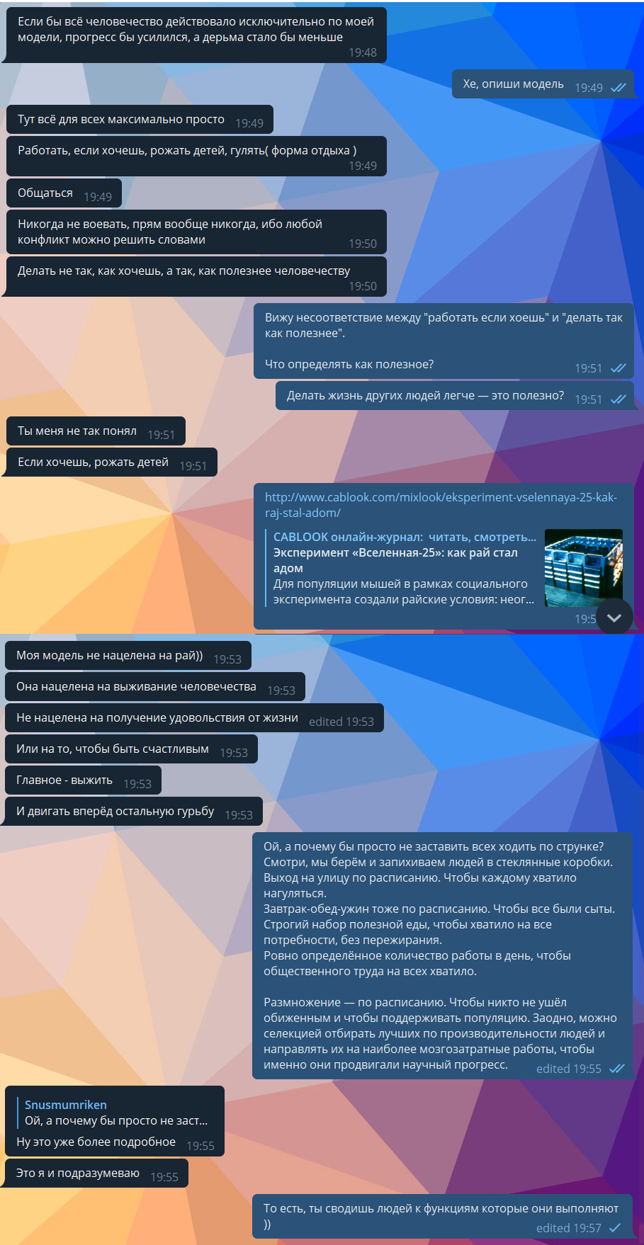Если бы всё человечество действовало исключительно по моей модели, прогресс бы усилился, а дерьма стало бы меньше