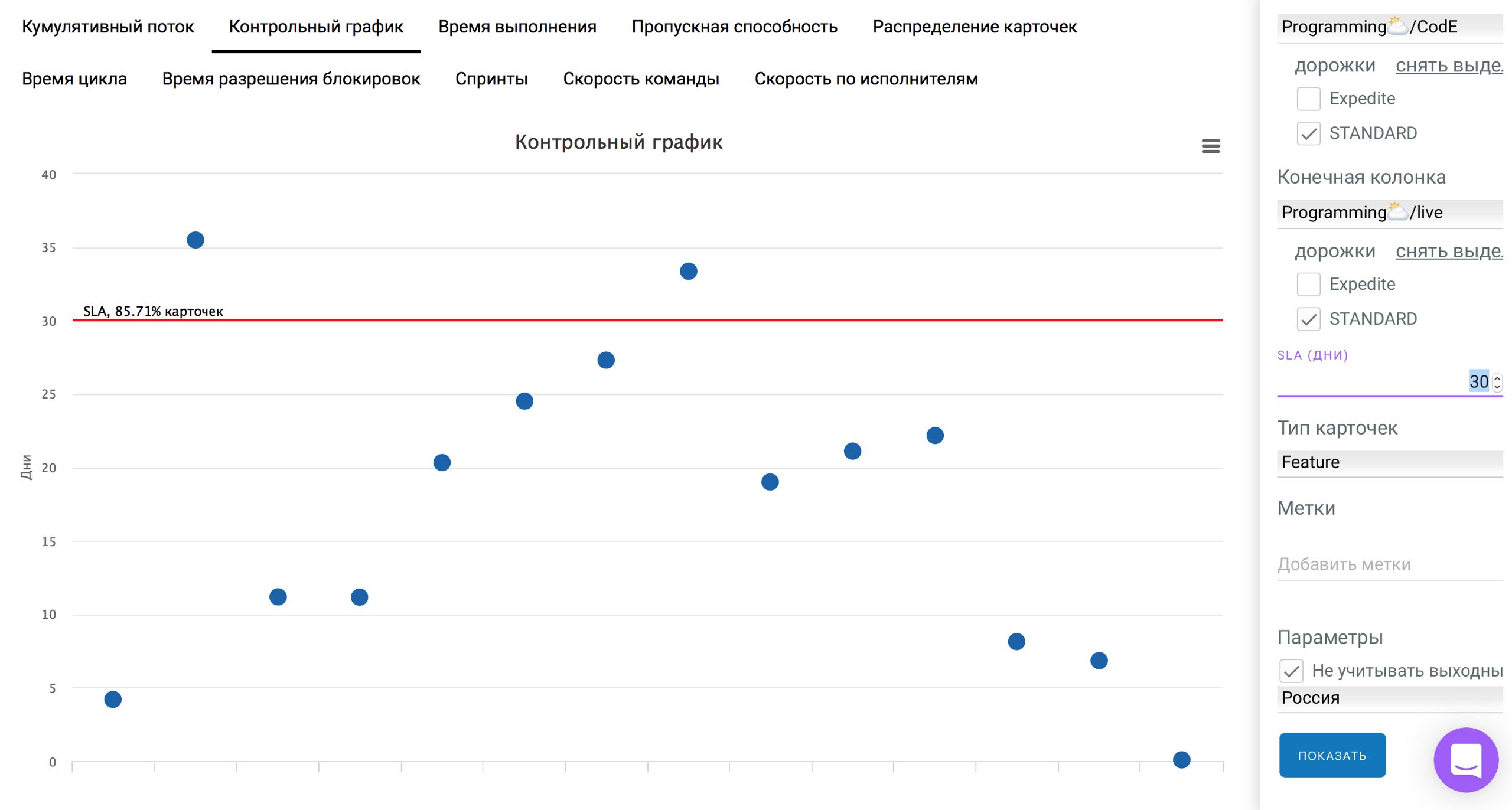 если у вас команда делает 85% фич в интервали 30 рабочих дней (это 30 / 5 = ~6 недель)