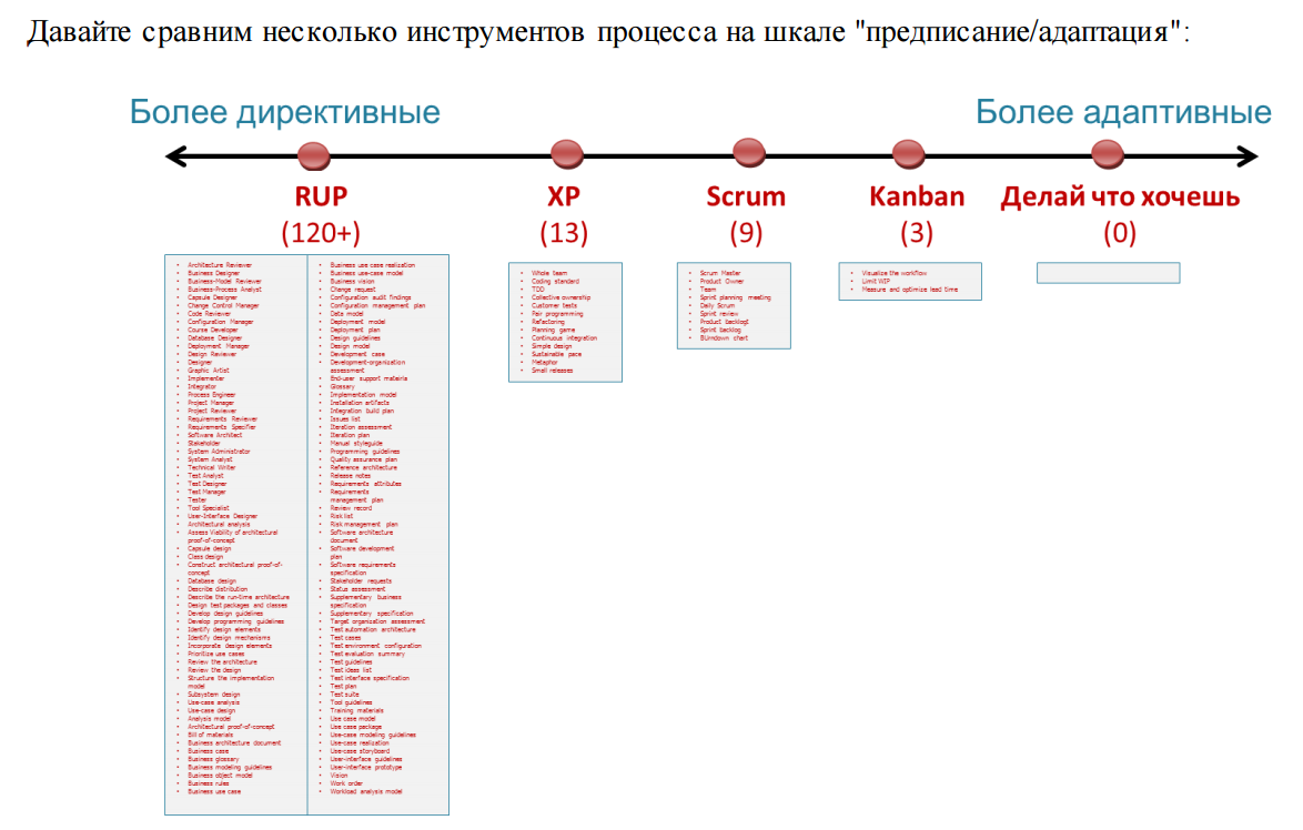 Давайте сравним несколько инструментов процесса на шкале "предписание/адаптация":