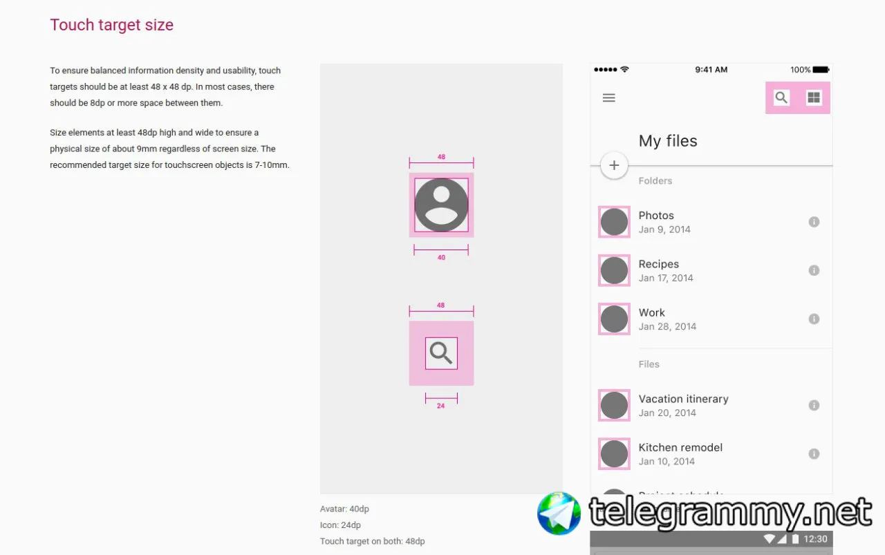 Дизайнер интересуется, какие нормальные размеры у кликабельных иконок в dp? Можно ссылочку на гайды)