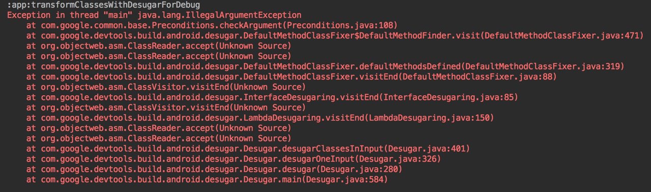 Вылазили разные эксепшены связанные с desugar, помгал clean. Один раз помого invalodate&restart. Вылазило обычно после правок в гладл файле.