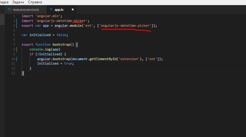 Ну то что я вижу по скриншотам... Дополнительный модуль подключается при определении основного в зависимостях. Типа: angular.module('main', ['ext', ...]). И бутстрапят как раз основной модуль... На одном и том же куске разметки не может быть двух ангуляровских аппликух и об этом тебе бы точно прокричали бы в консоль... Значит ты свой дополнительный модуль вообще хрен знает куда присобачил...
