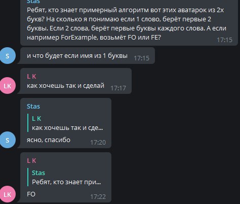 Ребят, кто знает примерный алгоритм вот этих аватарок из 2х букв? На сколько я понимаю если 1 слово, берёт первые 2 буквы. Если 2 слова, берёт первые буквы каждого слова. А если например ForExample, возьмёт FO или FE?