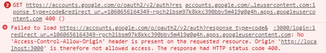 Failed to load https://accounts.google.com/o/oauth2/v2/auth?response_type=code&redirect_uri=http%3A%2F%2Flocalhost%3A3000%2Fauth%2Fgoogle%2Fredirect&scope=profile%20email%20openid&client_id=1060656164349-rpch2ibsm97k8kkc390bbv5m419g0g4h.apps.googleusercontent.com: No 'Access-Control-Allow-Origin' header is present on the requested resource. Origin 'http://localhost:3000' is therefore not allowed access.