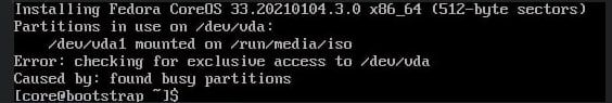 Пытаюсь поставить fc coreos. При загрузке live-инсталлера fedora-coreos, система монтирует имидж в /dev/vda1 и из-за этого нельзя установить систему - получаю ошибку, что диск используется.