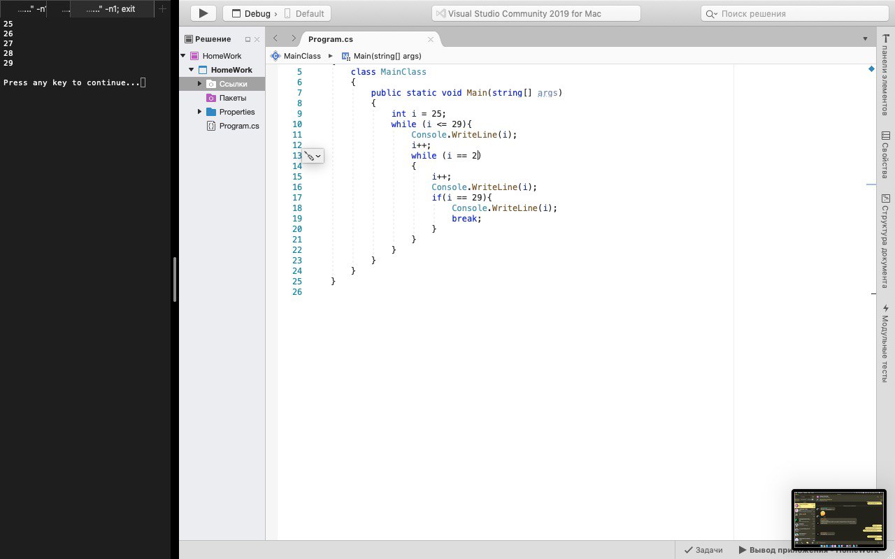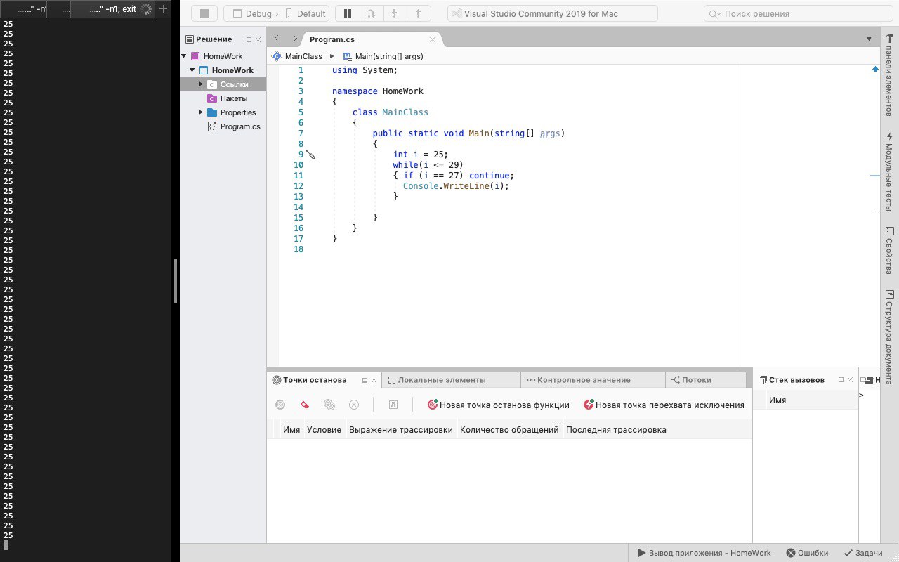 for(int I = 25; I <= 29; I++){if(I ==27) continue; Console.WriteLine(I);}