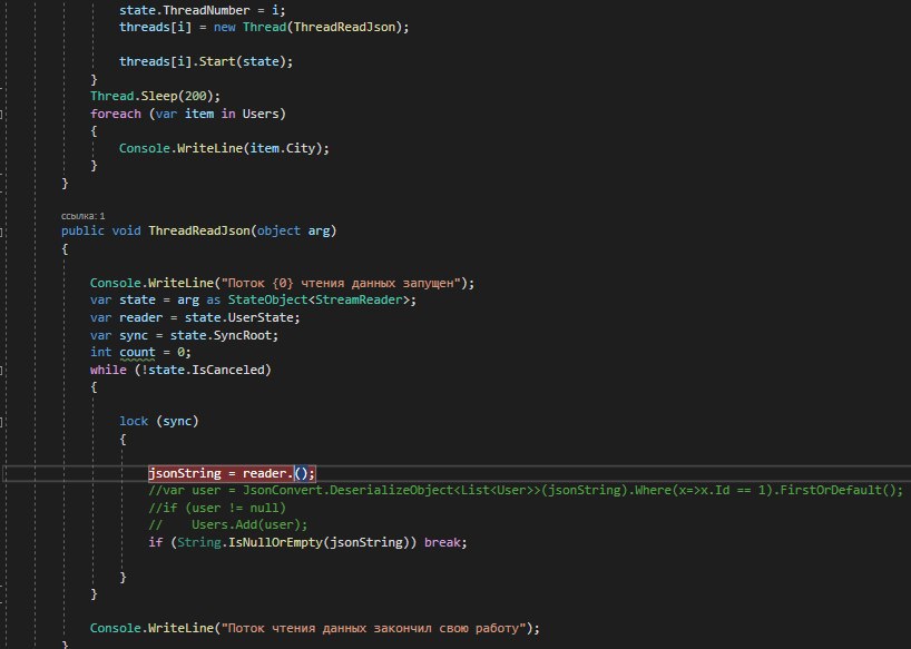 Помогите, пожалуйста, решить проблему . У меня есть несколько потоков, которые параллельно читают Json. Такая ситуация, когда при помощи ReadToEnd читаю json, эта реализация подразумевает под собой курсор, который при прохождении всего документа попадает в конец и в результате второму потоку ничего не достается и результатом получается ""