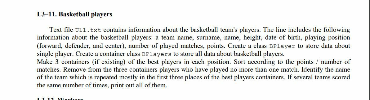 Имеется *.txt, в котором находиться информация об игроках команды(имя, фамилия, рост, название команды, дата рождения, набранные очки, кол-во сыгранных матчей и позиция на которых они играют(форвард, защитник, центровой).