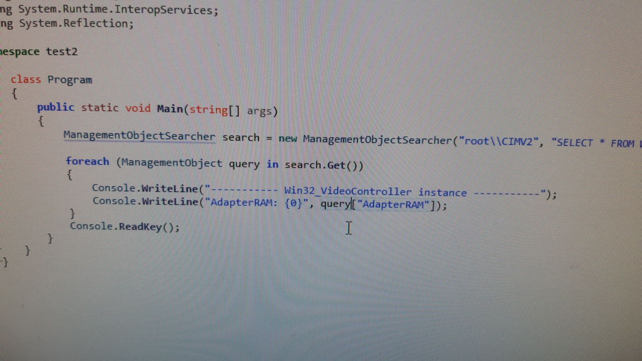 ManagementObjectSearcher searcher11 =     new ManagementObjectSearcher("root\\CIMV2",     "SELECT * FROM Win32_VideoController");   foreach (ManagementObject queryObj in searcher11.Get()) {     Console.WriteLine("----------- Win32_VideoController instance -----------");     Console.WriteLine("AdapterRAM: {0}", queryObj["AdapterRAM"]);     Console.WriteLine("Caption: {0}", queryObj["Caption"]);     Console.WriteLine("Description: {0}", queryObj["Description"]);     Console.WriteLine("VideoProcessor: {0}", queryObj["VideoProcessor"]); }   Console.Write("Press any key to continue . . . ");             Console.ReadKey(true);         }