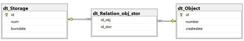 Добрый день, господа программисты. Совет нужен по правильной организации структуры объектов. На рисунке модель данных из трех таблиц. "Объекты" могут включать в себя несколько "Хранилищ данных", а также одно "хранилице" может хранить несколько "объектов". Для dt_Storage и dt_Object создал классы. А как лучше реализовать связь между этими объектами? На данный момет я сделал в каждом поле SortedList<string, int> - <obj_num, obj_id> и <stor_num, stor_id>. Но на сколько это решение правильное?