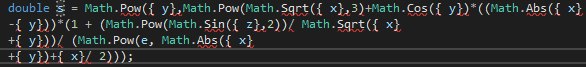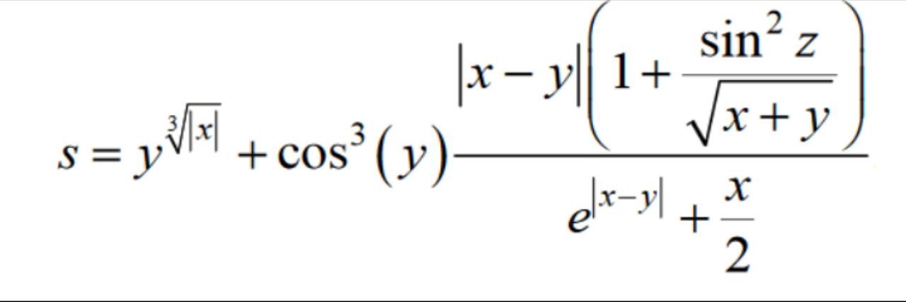double s = Math.Pow((y), Math.Pow(Math.Sqrt((Math.Abs(x))), 3)) + Math.Cos((y)) * ((Math.Abs((x) - (y))) * (1 + (Math.Pow(Math.Sin((z)), 2)) / Math.Sqrt((x) + (y))) / (Math.Pow(e, Math.Abs((x) + (y)) + (x) / 2)));