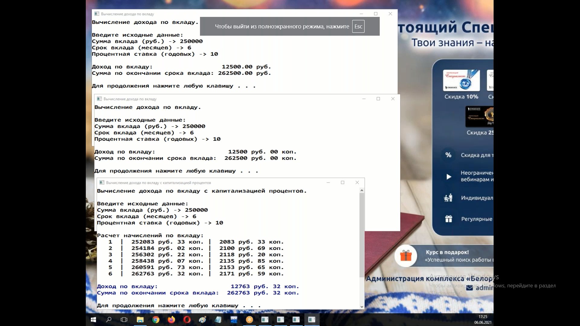 Как я поняла ему надо вывести все что происходит в цикле и (или только) доход от вклада и сумма по окончании срока вклада
