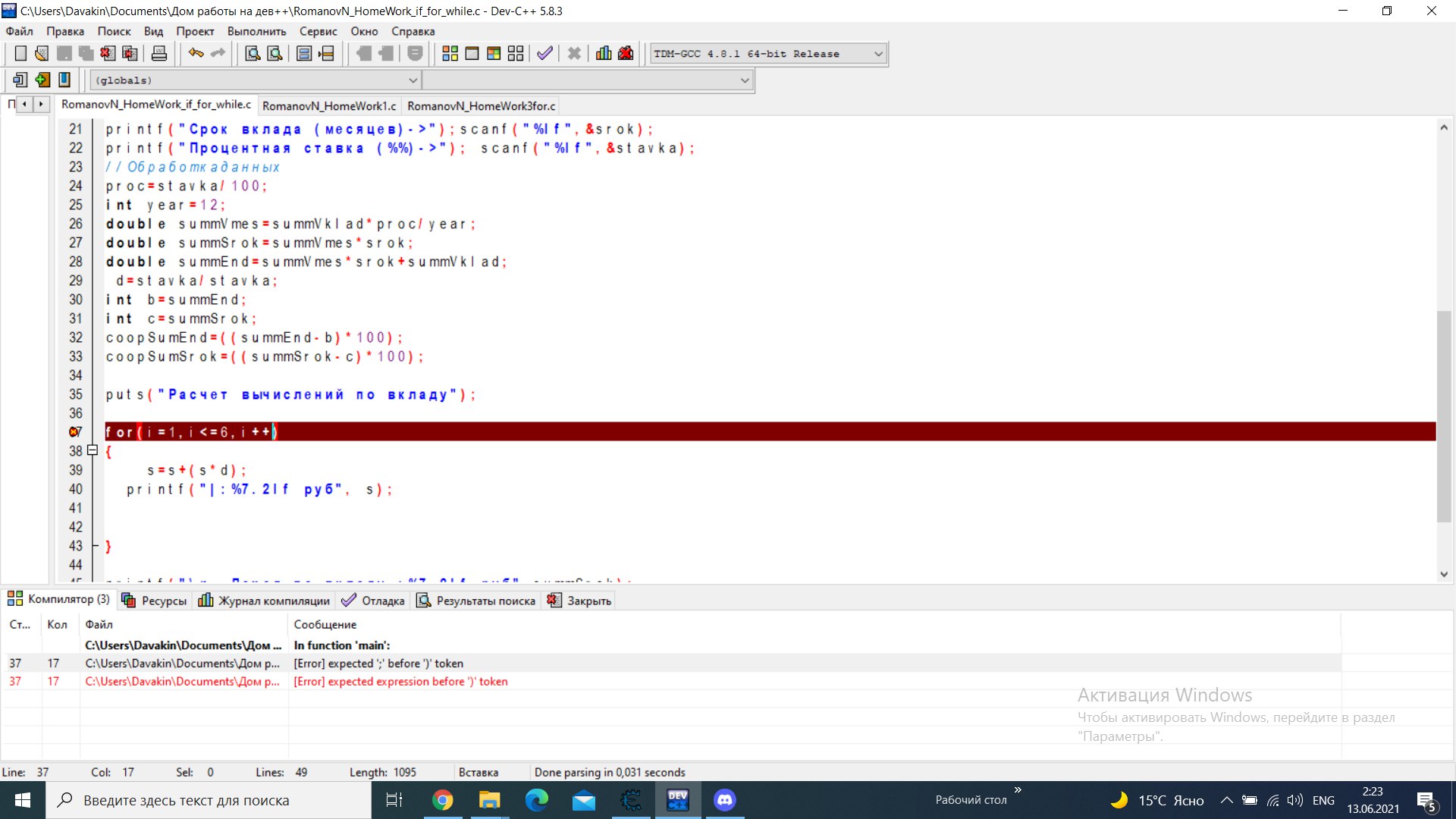 for(i=1,i<=6,i++ ); чет ругается на это место ....