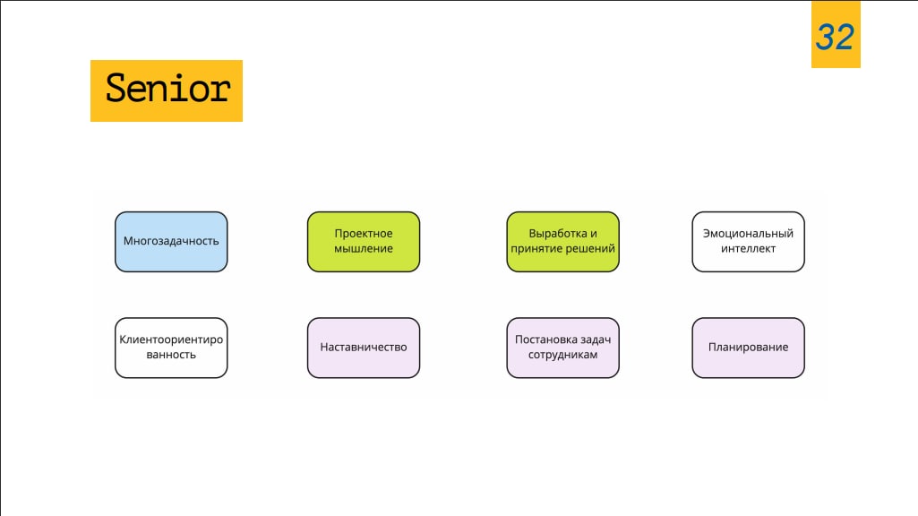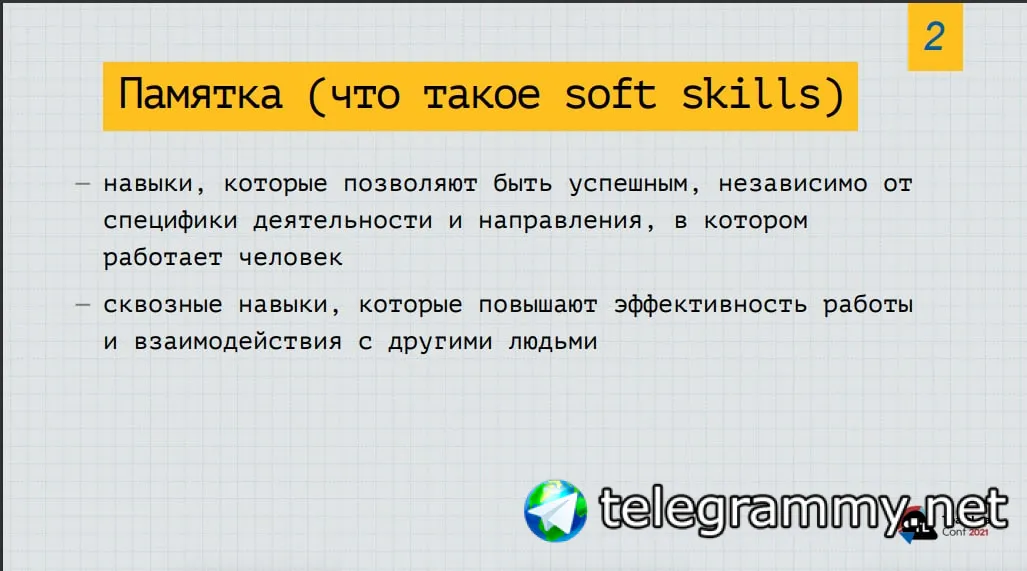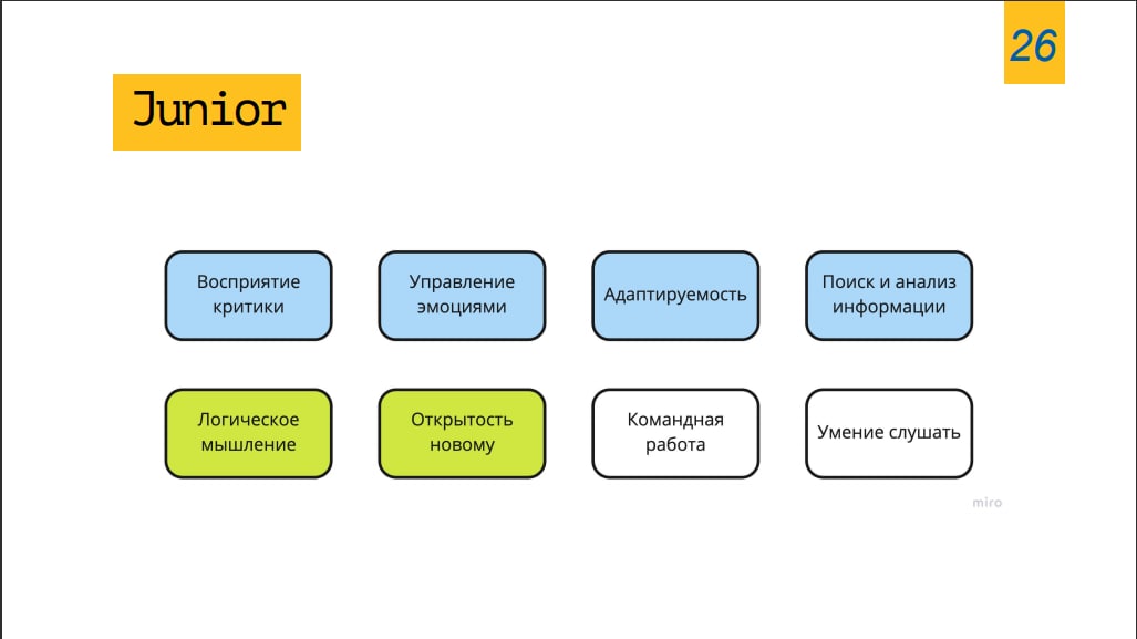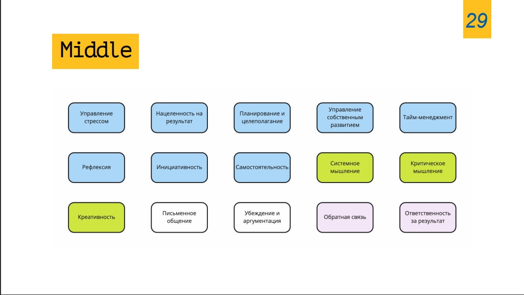 Ну не знаю, у всех же по-разному. Я видел очень крутой доклад по софт-скиллам. Не уверен, что его можно вот так полностью отправлять сюда, но я попробую показать парочку итоговых слайдов, чтобы было примерное понимание.